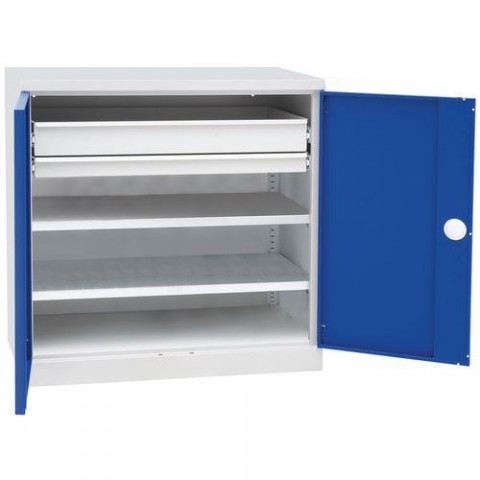 Dílenská skříň vhodná pro uložení pracovních nástrojů a pomůcek. Skříň je vybavena dvěma výškově nastavitelnými policemi a dvěma zásuvkami. Police jsou přestavitelné v rastru 25 mm. Uzamykatelná pomocí integrovaného zámku. Vyrobena z plechu tl. 0,9 mm.Dílenská skříň na nářadí Manutan Expert, 100 x 100 x 50 cm, se 2 zásuvkami