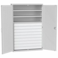 Kovové dílenské skříně vybaveny policemi s nosností 160 kg a zásuvkami pro efektivní využití v provozech a dílnách. Robustní svařovaná ocelová konstrukce s nosností až 1,5 tuny, povrchová úprava práškovým lakem. Vyztužené křídlové dveře s perforovanou vnitřní stranou pro uložení nářadí. Tříbodový cylindrický rozvorový zámek se dvěma klíči. Pozinkované police výškově nastavitelné v rastru 25 mm. Zásuvky s nosností 75 kg a 100% výsuvem na válečkových ložiskách.Dílenské skříně se zásuvkami Bott Cubio 160, výška 200 cm