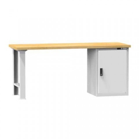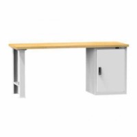Dílenské stoly Kombi se skříňkou a s pracovní deskou o šířce 150 cm a síle 40 mm. Vysoce kvalitní robustní pracovní deska z bukových hranolů průběžně lepených do tvaru desky a následně broušená a ošetřená roztokem lněného oleje s přísadami. Zásuvková skříň se dvěma policemi je opatřená mechanismem centrálního zamykání a blokace zásuvek. Standardně jsou zásuvkové skříně osazeny cylindrickými zámky, ke každému zámku jsou dodávány dva klíče. Dostupné ve třech barevných variantách (modrá, tmavě modrá, šedá). Pracovní prostor lze rozšířit díky nástavbě pracovního stolu a širokému příslušenství. Nosnost stolu je 1 100 kg.Dílenské stoly Kombi se skříňkou, 88 x 150 x 70 cm, buk