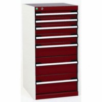 Zásuvkové skříně Bott Cubio se zásuvkami s nosností 75 kg a 100% výsuvy na válečkových ložiskách. Robustní svařovaná ocelová konstrukce s nosností až 1,5 tuny, povrchová úprava práškovým lakem. Systém centrálního zámku i blokace otevření více zásuvek najednou. Ergonomické rukojeti s popisovatelnou lištou, uzamykání cylindrickým zámkem se dvěma klíči.Dílenské zásuvkové skříně Bott Cubio, 100 x 52,5 x 52,5-65 cm, 7 zásuvek