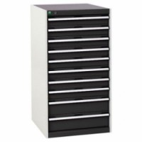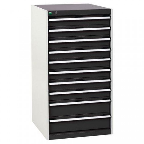 Zásuvkové skříně Bott Cubio se zásuvkami s nosností 75 kg a 100% výsuvy na válečkových ložiskách. Robustní svařovaná ocelová konstrukce s nosností až 1,5 tuny, povrchová úprava práškovým lakem. Systém centrálního zámku i blokace otevření více zásuvek najednou. Ergonomické rukojeti s popisovatelnou lištou, uzamykání cylindrickým zámkem se dvěma klíči.Dílenské zásuvkové skříně Bott Cubio, 120 x 65 x 52,5-75 cm, 10 zásuvek
