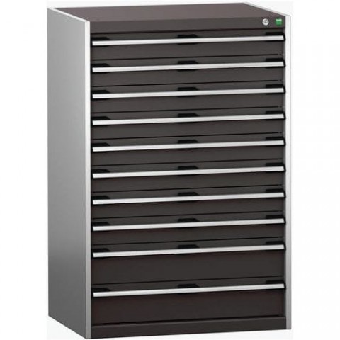Zásuvkové skříně Bott Cubio se zásuvkami s nosností 200 kg a 100% výsuvy na válečkových ložiskách. Robustní svařovaná ocelová konstrukce s nosností až 1,5 tuny, povrchová úprava práškovým lakem. Systém centrálního zámku i blokace otevření více zásuvek najednou. Ergonomické rukojeti s popisovatelnou lištou, uzamykání cylindrickým zámkem se dvěma klíči.Dílenské zásuvkové skříně Bott Cubio 200, 120 x 80 x 65-75 cm, 10 zásuvek