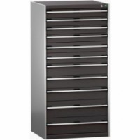 Zásuvkové skříně Bott Cubio se zásuvkami s nosností 200 kg a 100% výsuvy na válečkových ložiskách. Robustní svařovaná ocelová konstrukce s nosností až 1,5 tuny, povrchová úprava práškovým lakem. Systém centrálního zámku i blokace otevření více zásuvek najednou. Ergonomické rukojeti s popisovatelnou lištou, uzamykání cylindrickým zámkem se dvěma klíči.Dílenské zásuvkové skříně Bott Cubio 200, 160 x 80 x 65-75 cm, 11 zásuvek