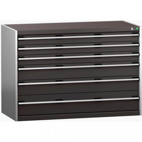 Zásuvkové skříně Bott Cubio se zásuvkami s nosností 200 kg a 100% výsuvy na válečkových ložiskách. Robustní svařovaná ocelová konstrukce s nosností až 1,5 tuny, povrchová úprava práškovým lakem. Systém centrálního zámku i blokace otevření více zásuvek najednou. Ergonomické rukojeti s popisovatelnou lištou, uzamykání cylindrickým zámkem se dvěma klíči.Dílenské zásuvkové skříně Bott Cubio 200, 90 x 130 x 65-75 cm, 6 zásuvek