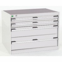 Zásuvkové skříně Bott Cubio se zásuvkami s nosností 75 kg a 100% výsuvy na válečkových ložiskách. Robustní svařovaná ocelová konstrukce s nosností až 1,5 tuny, povrchová úprava práškovým lakem. Systém centrálního zámku i blokace otevření více zásuvek najednou. Ergonomické rukojeti s popisovatelnou lištou, uzamykání cylindrickým zámkem se dvěma klíči.Dílenské zásuvkové skříně Bott Cubio, 60 x 80 x 52,5-75 cm, 4 zásuvky