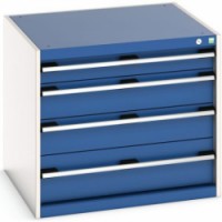 Zásuvkové skříně Bott Cubio se zásuvkami s nosností 75 kg a 100% výsuvy na válečkových ložiskách. Robustní svařovaná ocelová konstrukce s nosností až 1,5 tuny, povrchová úprava práškovým lakem. Systém centrálního zámku i blokace otevření více zásuvek najednou. Ergonomické rukojeti s popisovatelnou lištou, uzamykání cylindrickým zámkem se dvěma klíči.Dílenské zásuvkové skříně Bott Cubio, 70 x 80 x 52,5-75 cm, 4 zásuvky