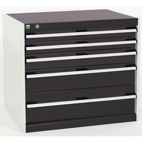 Zásuvkové skříně Bott Cubio se zásuvkami s nosností 75 kg a 100% výsuvy na válečkových ložiskách. Robustní svařovaná ocelová konstrukce s nosností až 1,5 tuny, povrchová úprava práškovým lakem. Systém centrálního zámku i blokace otevření více zásuvek najednou. Ergonomické rukojeti s popisovatelnou lištou, uzamykání cylindrickým zámkem se dvěma klíči.Dílenské zásuvkové skříně Bott Cubio, 70 x 80 x 52,5-75 cm, 5 zásuvek