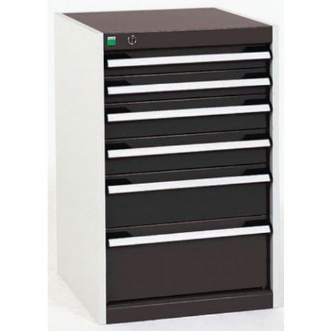 Zásuvkové skříně Bott Cubio se zásuvkami s nosností 75 kg a 100% výsuvy na válečkových ložiskách. Robustní svařovaná ocelová konstrukce s nosností až 1,5 tuny, povrchová úprava práškovým lakem. Systém centrálního zámku i blokace otevření více zásuvek najednou. Ergonomické rukojeti s popisovatelnou lištou, uzamykání cylindrickým zámkem se dvěma klíči.Dílenské zásuvkové skříně Bott Cubio, 80 x 52,5 x 52,5-65 cm, 6 zásuvek