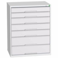 Kovové dílenské skříně Bott Verso se zásuvkami pro efektivní využití v provozech a dílnách. Zásuvky s nosností 75 kg a 100% výsuvy na válečkových ložiskách. Svařovaná ocelová konstrukce, povrchová úprava práškovým lakem. Centrální uzamykání cylindrickým zámkem se dvěma klíči.Dílenské zásuvkové skříně Bott Verso, výška 100 cm, 7 zásuvek