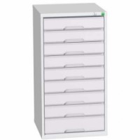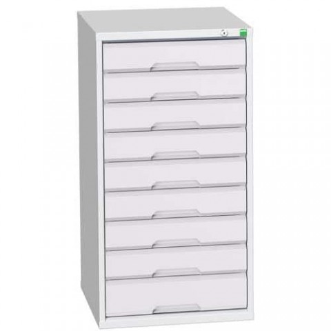 Kovové dílenské skříně Bott Verso se zásuvkami pro efektivní využití v provozech a dílnách. Zásuvky s nosností 75 kg a 100% výsuvy na válečkových ložiskách. Svařovaná ocelová konstrukce, povrchová úprava práškovým lakem. Centrální uzamykání cylindrickým zámkem se dvěma klíči.Dílenské zásuvkové skříně Bott Verso, výška 100 cm, 9 zásuvek