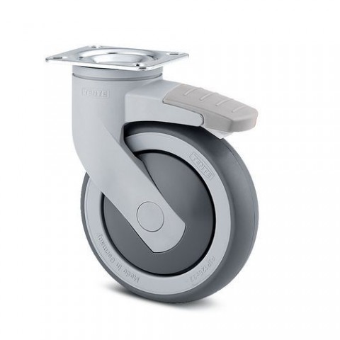 Otočná neznačkující přístrojová kolečka pro univerzální použití. Totální brzda, která zabrzdí jak kolo, tak otočný mechanismus, čímž umožní rychlé zajištění přepravního zařízení. Vidlice a kolečka vyrobeny z vysoce kvalitních syntetických materiálů. Dvojitá kuličková dráha v otočné hlavě. Uchycení pomocí plotýnky. Střed kolečka vyroben z polypropylénu. Kolečka jsou vybavena krytem proti namotávání vláken a přesným kuličkovým ložiskem. Kolečka splňují požadavky dle EN 12530.Gumová přístrojová kola s přírubou, průměr 100 - 125 mm, otočná s brzdou, kuličková ložiska