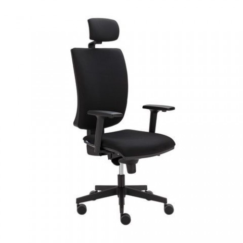 Kancelářská židle s anatomicky tvarovaným opěrákem. Robustní plastový nylonový kříž a výškově stavitelné područky v rozmězí až 20 cm. Vysoká nosnost a pogumovaná kolečka. Synchronní mechanismus.Kancelářská židle Lira II s podhlavníkem, černá