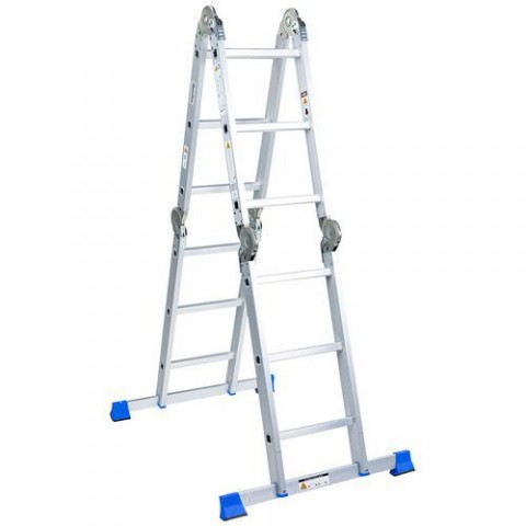Kloubový hliníkový žebřík ze čtyř dílů po třech příčkách, vhodný pro profesionální použití. Možnost sestavení jako opěrný žebřík, stojací štafle nebo lešení. Součástí je pochozí ocelová podlážka. Pracovní výška - lešení 2,8 m; štafle 2,92 m a opěrný žebřík 4,1 m. Celková výška - lešení 0,9 m; štafle 1,62 m a opěrný žebřík 3,3 m. Žebřík je opatřen ochrannými patkami.Kloubový hliníkový žebřík Manutan Expert s podlážkou, 4 x 3 příčky