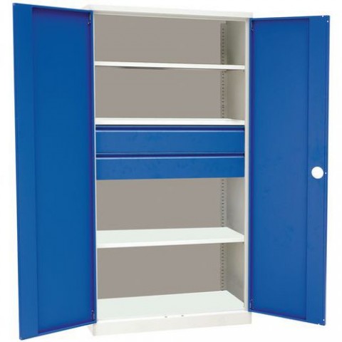 Dílenská skříň vhodná pro uložení pracovních nástrojů a pomůcek. Skříň je vybavena třemi výškově stavitelnými policemi a dvěma zásuvkami. Police i zásuvky jsou přestavitelné v rastru 20 mm. Zásuvky jsou umístěny na kuličkových výsuvech. Vyrobena z plechu tl. 0,9 mm. Uzamykání cylindrickým rozvorovým zámkem.Kovová dílenská skříň Manutan Expert, 195 x 100 x 45 cm