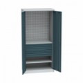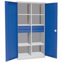 Dílenská skříň s mezistěnou je vhodná pro uložení pracovních nástrojů a pomůcek. Skříň je vybavena šesti výškově stavitelnými policemi a čtyřmi zásuvkami s výškou 109 mm. Police jsou přestavitelné v rastru 20 mm. Zásuvky jsou umístěny na kuličkových výsuvech. Vyrobena z plechu tl. 0,9 mm. Uzamykání cylindrickým rozvorovým zámkem.Kovová dílenská skříň Manutan Expert, 195 x 100 x 45 cm