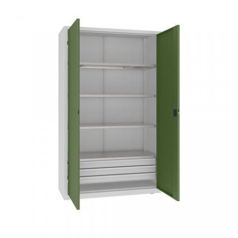 Dílenské kovové skříně se třemi zásuvkami a čtyřmi policemi vhodné pro profesionální použití ve vnitřních suchých a větraných prostorách. Monolitická svařovaná konstrukce z oceli tl. 1 mm zajišťuje vysokou pevnost. Křídlové dveře s tříbodovým zámkem RONIS (dodáváno se 2 klíči). Vyrovnávací nožky, které jsou nastavitelné zevnitř. Posuvníky pro snadný pohyb skříně a ochranu podlahy. Pro vysokou bezpečnost lze přikotvit ke zdi. Před lakováním jsou skříně potaženy zirkoniovou vrstvou, která je chrání před korozí a zvyšuje přilnavost laku. Skříně jsou opatřené nátěrem, který má klasifikaci reakce na oheň: A2-s1, d0 dle norem PN-EN 13501-1:2019-02. Vyráběno v souladu s normami ISO:9001 a ISO:14001.Kovové dílenské skříně, 199 x 120 x 50 cm, 3 zásuvky