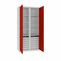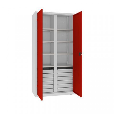 Vysoké dílenské skříně se zásuvkami vhodné pro ukládání dílenského vybavení a materiálu. Monolitická svařovaná konstrukce z oceli tl. 1 mm zajišťuje vysokou pevnost. Vhodné pro profesionální použití ve vnitřních suchých a větraných prostorách. Vybavené 12 zásuvkami ve spodní části skříně a 6 galvanizovanými policemi, které lze nastavit v rastru 25 mm. Křídlové dveře s tříbodovým zámkem RONIS (dodáváno se 2 klíči). Vyrovnávací nožky, které jsou nastavitelné zevnitř. Posuvníky pro snadný pohyb skříně a ochranu podlahy. Pro vysokou bezpečnost lze přikotvit ke zdi. Před lakováním jsou skříně potaženy zirkoniovou vrstvou, která je chrání před korozí a zvyšuje přilnavost laku. Skříně jsou opatřené nátěrem, který má klasifikaci reakce na oheň: A2-s1, d0 dle norem PN-EN 13501-1:2019-02. Vyráběno v souladu s normami ISO:9001 a ISO:14001.Kovové dílenské skříně na nářadí se zásuvkami, 199 x 100 x 50 cm, 12 zásuvek