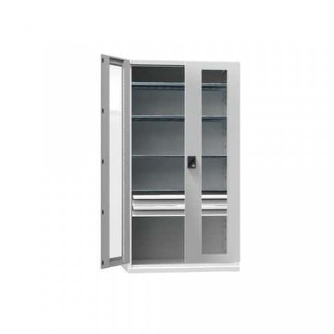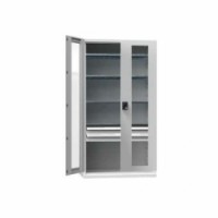 Nářaďové skříně s prosklenými křídlovými dveřmi s úhlem otevření 180°. Stabilní konstrukce z ocelových plechů. Prosklená dvířka používají bezpečnostní tvrzené sklo. Součástí jsou 4 police výškově stavitelné po 25 mm a dvě zásuvky. Skříně jsou navrženy mimo jiné pro použití závěsného programu a zásuvek velikosti 54 x 27D. Dveře lze uzamknout pomocí zámku s dvoubodovým zamykacím systémem s tichým chodem. Lze využít perforované panely k zavěšení závěsného programu, osazení na zadní či boční stěnu skříně. K dostání ve 3 barevných odstínech. Nosnost skříně je 600 kg.Kovové dílenské skříně na nářadí SK1 s prosklenými dveřmi, 1950 x 1044 x 625 mm, 4 police a 2 zásuvky, šedá