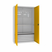 Kovové skříně s perfopanelem pro uložení dílenského nářadí. Vybavené perforovaným panelem, na který lze umístit držáky nářadí a materiálu. 4 zásuvky a 2 nastavitelné pozinkované police v rastru 25 mm. Monolitická svařovaná konstrukce z oceli tl. 1 mm zajišťuje vysokou pevnost. Vhodné pro profesionální použití ve vnitřních suchých a větraných prostorách. Křídlové dveře s tříbodovým zámkem RONIS (dodáváno se 2 klíči). Vyrovnávací nožky, které jsou nastavitelné zevnitř. Posuvníky pro snadný pohyb skříně a ochranu podlahy. Pro vysokou bezpečnost lze přikotvit ke zdi. Před lakováním jsou skříně potaženy zirkoniovou vrstvou, která je chrání před korozí a zvyšuje přilnavost laku. Skříně jsou opatřené nátěrem, který má klasifikaci reakce na oheň: A2-s1, d0 dle norem PN-EN 13501-1:2019-02. Vyráběno v souladu s normami ISO:9001 a ISO:14001.Kovové dílenské skříně s perfopanelem, 199 x 120 x 50 cm, 4 zásuvky