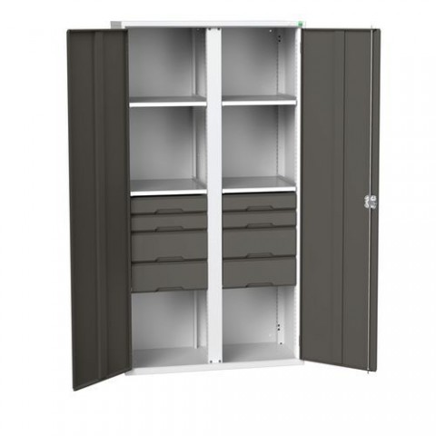 Kovové skříně pro specifické použití v provozech - podle typu vybaveny policemi, zásuvkami, středovou přepážkou nebo i tyčí na ramínka. Pozinkované police s nosnsostí 75 kg, výškově nastavitelné v rastru 25 mm. Zásuvky s nosností 75 kg a 100% výsuvem na válečkových ložiskách. Svařovaná ocelová konstrukce, povrchová úprava práškovým lakem. Vyztužené křídlové dveře s tříbodovým cylindrickým rozvorovým zámkem se dvěma klíči.Kovové skříně pro údržbu Bott Verso, výška 200 cm