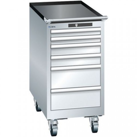 Žebrovaná protiskluzová podložka na vrchu skř??ně. Pohyb umožnují 4 kolečka a madlo na manipulaci. Zámek na klíč. Optimální využití díky plnému výsuvu a optimální výšce čela zásuvek. Vynikající ochrana proti prachu, kapalinám a mechanickému opotřebení díky uzavřenému rámu s povrchem odolným proti nárazům a oděru. Systém proti převrátcení, který zabraňuje pádu zásuvky, a individuální zamykání zásuvek. Ochrana proti korozi elektroforetickým imerzním lakováním a stříkáním. Optimalizované úložné prostory a organizace díky dělicímu materiálu LISTA přizpůsobenému každému použití a zásuvkám vybaveným drážkami a perforacemi. Profesionální popisování s popisovacím softwarem LISTA Script a výklopnou úchytkou pro vkládání štítků. Dokonale tichý pohyb díky saně bez příčníku.Mobilní dílenské zásuvkové skříně Lista, 6 zásuvek, 411x725x840mm