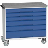 Mobilní pracovní stůl se zásuvkami Bott Verso s horní pracovní plochou tloušťky 3 cm typu multiplex/linoleum nebo ohraněný plech s rohoží. Nosnost až 200 kg, robustní svařovaná ocelová konstrukce, povrchová úprava práškovým lakem. Centrálně uzamykatelné zásuvky s výškou 2 x 7,5 cm, 3 x 10, 1 x 15 a 1 x 20 cm, nosností 50 kg a 100% výsuvem na válečkových ložiskách. Ergonomické rukojeti zásuvek s popisovatelnou lištou, systém blokace otevření více zásuvek najednou. Dvě pevná a dvě otočná kola s brzdou o průměru 12,5 cm, manipulaci usnadňují madla.Mobilní zásuvkové stoly Bott Verso, 98 x 80/105 x 55/60 cm, 6 zásuvek, multiplex/linoleum/rohož