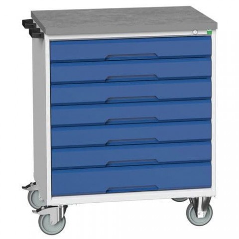 Mobilní pracovní stůl se zásuvkami Bott Verso s horní pracovní plochou tloušťky 3 cm typu multiplex/linoleum nebo ohraněný plech s rohoží. Nosnost až 200 kg, robustní svařovaná ocelová konstrukce, povrchová úprava práškovým lakem. Centrálně uzamykatelné zásuvky s výškou 6 x 10, 1 x 12,5 cm, nosností 50 kg a 100% výsuvem na válečkových ložiskách. Ergonomické rukojeti zásuvek s popisovatelnou lištou, systém blokace otevření více zásuvek najednou. Dvě pevná a dvě otočná kola s brzdou o průměru 12,5 cm, manipulaci usnadňují madla.Mobilní zásuvkové stoly Bott Verso, 98 x 80/105 x 55/60 cm, 7 zásuvek, multiplex/linoleum/rohož