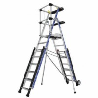 Nastavitelné platformy Sherpascopic. Pevné 4stranné zábradlí s ochrannými lištami proti pádu s poloautomatickým zavíráním. Protiskluzové schůdky 80 mm (pevná plocha) a 60 mm (teleskopická plocha). Odnímatelný přihrádkový držák nářadí - nosnost 25 kg, s integrovanými háčky (max. 10 kg). Vysoce komfortní 590 x 400 mm protiskluzová platforma ze dřeva. Výsuvné stabilizátory s milimetrovým nastavením. Teleskopické roviny umožňující posun úrovní. Intuitivní a bezpečný systém nastavení výšky, nastavení každých 23 cm (po krocích). Součástí jsou dvě kola o průměru 175 mm.Nastavitelné hliníkové plošiny Sherpascopic Tubesca-Comabi