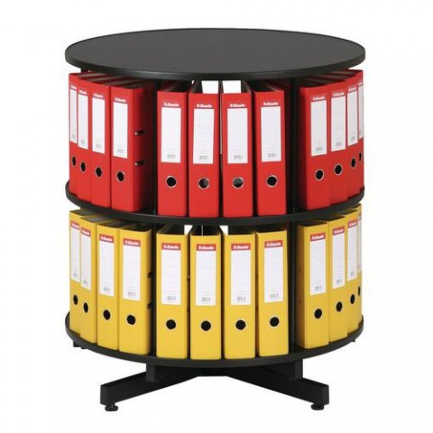 Otočné skříně na šanony. Jednoduché otáčení díky ložisku v nosném kříži. Rektifikační šrouby k vyrovnání nerovnosti podlahy. Možnost dokoupit další patra nebo sadu koleček.Otočné skříně na pořadače, průměr 81 cm, černé