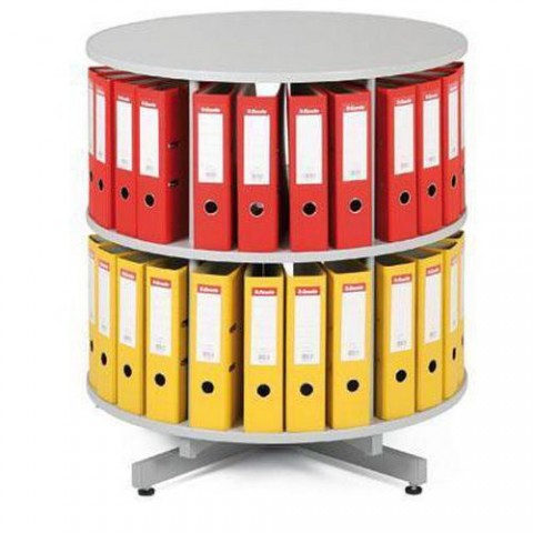 Otočné skříně na šanony. Jednoduché otáčení díky ložisku v nosném kříži. Rektifikační šrouby k vyrovnání nerovnosti podlahy. Možnost dokoupit další patra nebo sadu koleček.Otočné skříně na pořadače, průměr 81 cm, šedé