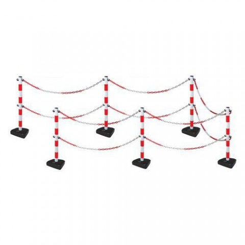 Sada šesti plastových zahrazovacích sloupků s řetězy a čtvercovou základnou pro navigaci osob. Sloupky jsou opatřené čtyřmi odjimatelnými háčky ve dvou výškách pro umístění řetězů. Voděodolné, nekorodující a odolné povětrnostním podmínkám. Řetěz je možné uskladnit uvnitř sloupku. Základnu je možné naplnit vodou nebo pískem pro vyšší stabilitu (váha sloupku následně vzroste z 1,3 kg až na 3,5 kg).Plastové zahrazovací sloupky Manutan Expert s řetězem, 90 cm, 6 ks