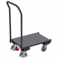 Plošinové vozíky s ložnou plochou z MDF desky. Ložná plocha je v jedné rovině s rámem. Vhodné pro umístění přepravek o rozměru 600 x 400 mm. Nakládací výška 235 mm. Čtyři otočná kola, z nichž dvě jsou opatřená brzdou EasySTOP. Šedá kola z termoplastické pryže nezanechávající stopy na plastovém ráfku s přesnými kuličkovými ložisky, ochrana nohou.Plošinové vozíky Euro s madlem, do 250 kg, 74 x 41,5 x 100 cm