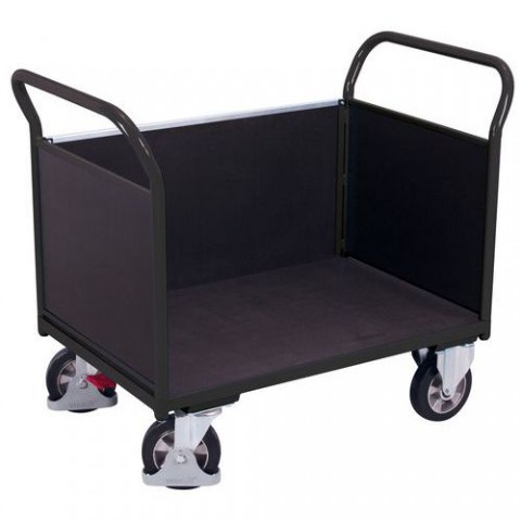 Manipulační vozíky s vysokou nosností, dvěma madly s plnou výplní a boční stěnou. Vozík je vyroben z pevné ocelové konstrukce, boční stěna a ložná plocha jsou z voděodolné překližky. Pohyb zajišťují čtyři kola s valivými kuličkovými ložisky, z nichž dvě jsou pevná a dvě otočná s brzdou Easy Stop.Plošinové vozíky se dvěma madly s plnou výplní a boční stěnou, do 1 000 kg