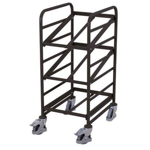 Vozík se třemi policemi pro umístění plastových přepravek o rozměru 600 x 400 mm. Naklonění polic o 17° nebo 32°, výška hrany 27 mm, nosnost 50 kg na polici. Vzdálenost mezi příčnými trubkami 125 mm. Rozteč otvorů pro přišroubování polic 150 mm. 4 otočná kola, z nichž dvě jsou opatřená brzdou. Šedá kola z termoplastické pryže nezanechávající stopy na plastovém ráfku s přesnými kuličkovými ložisky.Policové vozíky Euro na přepravky se šikmými policemi, 3 police, 52 x 66,5 x 116 cm