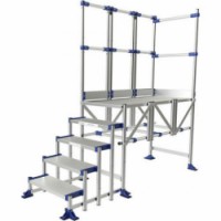 Modulární platformy se 2 zábradlími - 1 přední a 1 boční. Stabilní se širokou platformou a hlubokými protiskluzovými schůdky. Šířka plošiny 596 mm. Plošinu lze v případě potřeby připevnit k zemi pomocí velkých dvojitých pevných patek. Velmi odolná konstrukce, vhodná pro intenzivní používání, nutné rovné podlahy. Pohodlné, škálovatelné, všestranné, přizpůsobitelné všem typům potřeb.Přístupová plošina Meca Modul Tubesca-Comabi, 2 zábradlí