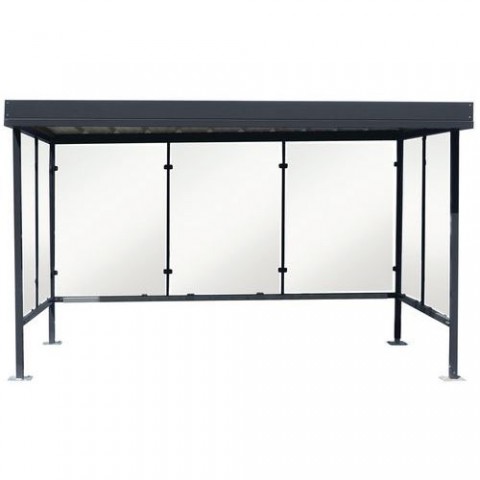 Přístřešky se skleněnou výplní vhodné pro suché stání kol, kuřácký koutek nebo lze použít jako čekárnu. Výplň tvoří bezpečnostní tvrzené sklo tl. 5 mm. Ocelová plechová střecha se zajištěným odtokem dešťové vody pomocí PE žlabů. Konstrukce vyrobená z pozinkovaných ocelových profilů 60 x 60 x 2 mm. Montážní šrouby z nerezové oceli třídy A2. Povrchová úprava termosetovou polyesterovou barvou vypálenou při 200 °C, která odolává UV záření. Čtyři nohy na platformě 200 x 200 x 5 mm, kterou lze připevnit k zemi. Pro připevnění k betonovému základu použijte kotevní šrouby M12/65, na čistý rovný asfalt použijte závitové tyče M12/120 (minimální tloušťka asfaltu 7 cm).Prosklené přístřešky Manutan Expert Beaulieau, délka 5 m