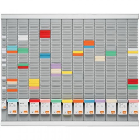 Plánovací sada s T-kartou obsahuje vše, co potřebujete k snadnému vytvoření 12měsíčního diáře pro měsíční, roční nebo projektové plánování. 12 proužků 32 slotů index 2, jeden proužek index 32 slotů index 1, 2 hliníkové držáky s barevnými titulními proužky. 10 balení kartotéčních lístků T se 100 kartotéčními lístky, index 2, v různých barvách a 1 balení kartotéčních lístků T se 100 kartotéčními lístky, index 1.Roční plánovací sada s kartami T Nobo