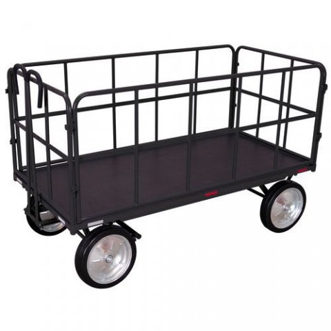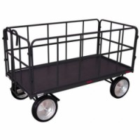 Ocelový ruční vozík se čtyřmi trubkovými bočnicemi, výška stěn 750 mm. Tažné madlo s měkkou rukojetí. Reflexní prvky na ocelové konstrukci. Automatická parkovací přední brzda a automatický tlumený návrat do klidové polohy. Ložná plocha z voděodolné lepené překližky s protiskluzovým povrchem. Nafukovací nebo plná gumová kola na plastovém ráfku s kuličkovými ložisky.Ruční vozíky s tažným madlem a 4 bočnicemi, do 1 000 kg