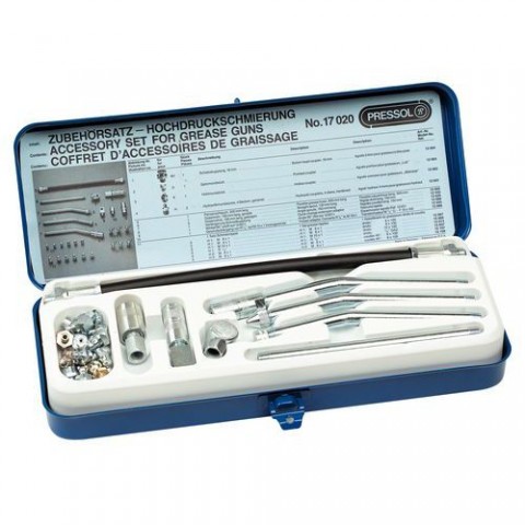 Obsahuje několik koncovek a hadic vhodných pro různé mazací systémy. Součástí sady je také kufřík.Sada mazacího příslušenství - Pressol