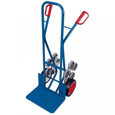 Schodišťový rudl s pětiramennými hvězdicovými koly s šedými nešpinivími pneumatikami z termoplastické pryže. Ocelová konstrukce s lopatou o rozměru 480 x 300 mm. Dvě plastová bezpečnostní madla. Pneumatiky na ocelovém ráfku nebo celopryžová kola na plastovém ráfku s přesnými kuličkovými ložisky a plastovým krytem kola.Schodišťové rudly RU249, do 200 kg