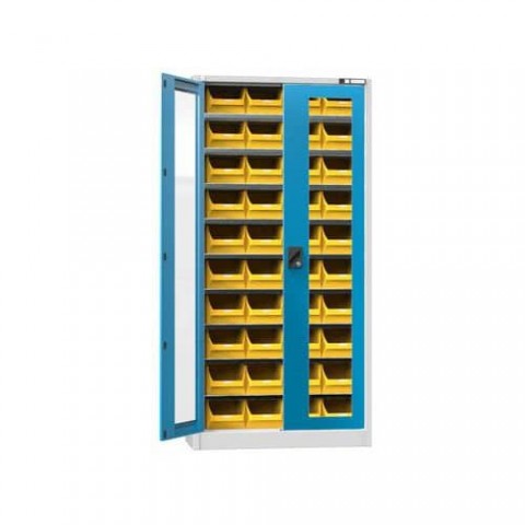 Skříně série UK s křídlovými dveřmi s úhlem otevření více než 90° jsou lehčí formou dílenských skříní. Použ??vají se především pro ukládání méně rozměrných a lehčích materiálů nebo jako úložiště plastových boxů pro drobnější materiál. Varianty se skleněnými dveřmi používají bezpečnostní tvrzené sklo. Skříně jsou zamykatelné originalním POLAK design zámkem dvoubodového zamykacího systému s tichým chodem. Police jsou stavitelné. Universální plechová skříň s křídlovými dveřmi s úhlem otevření více než 90° je lehčí formou dílenských skříní a používají se především pro ukládání méně rozměrných a lehčích materiálů nebo jako uložiště plastových boxů pro drobnější materiál. Prosklená dvířka používají bezpečnostní tvrzené sklo. Stabilní konstrukce z ocelových plechů.Skříňky s boxy UK1-B11S, 950 x 400 x 1950 mm