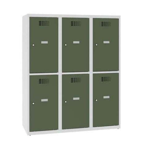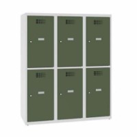 Snížené svařované šatní skříně se šesti samostatně uzamykatelnými oddíly. Jsou vhodné do škol a díky své výšce jsou ideální i pro žáky prvního stupně. Vyrobeny z ocelového plechu s povrchovou úpravou práškovým lakem. Skříně jsou vybaveny dvěma policemi na knihy a háčkem na oblečení. Větrací mřížky ve dveřích, úhel otevření dveří s bezpečnostní pojistkou max. na 90°, samolepicí štítek na jméno, možnost dokoupení horního šikmého nástavce. Uzamykání cylindrickým zámkem se dvěma klíči.Snížené školní šatní skříně, 6 oddílů, 400 mm, cylindrický zámek