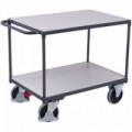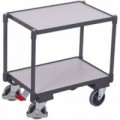 Antistatický policový vozík se dvěma policemi. Ložná plocha z elektricky vodivé laminátové dřevotřísky. Police v jedné rovině s kovovým rámem. 2 pevná a 2 otočná kola s brzdou EasySTOP. Šedá kola z termoplastické pryže nezanechávající stopy na plastovém ráfku s přesnými kuličkovými ložisky.Policové vozíky ESD, 2 police, do 400 - 500 kg