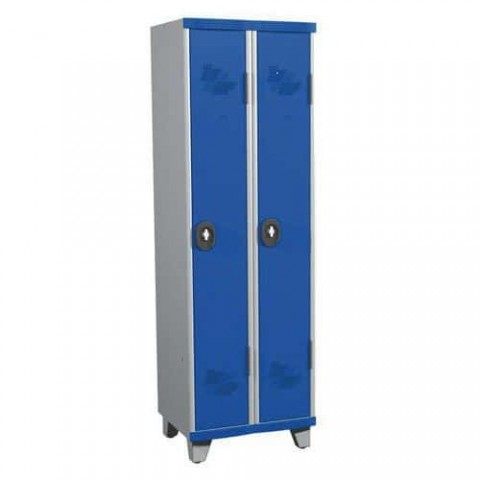 Svařovaná šatní skříň z odolného profilovaného ocelového plechu o tloušťce 0,6 mm (odpovídá 0,8 mm standardnímu). Odolná dvířka se otevírají až do úhlu 180°. Perforace ve dveřích i konstrukci skříně pro lepší odvod vlhkosti. Možnost umístění štítku se jménem. Uzamykání na visací zámek (není součástí dodávky, doporučený průměr třmenu 6 až 7 mm).Svařované šatní skříně Acial, 2 oddíly, 300 mm, na nohách, otočný uzávěr