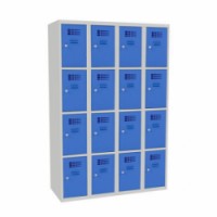 Svařované šatní skříně s boxy v několika barevných variantách, vhodné pro odkládání osobních věcí zaměstnanců na pracovištích, v převlékárnách nebo sportovních klubech. Odlehčená konstrukce z ocelového plechu tloušťky 0,5 mm s výztuhami zajišťuje dobrou stabilitu. Účinné odvádění vlhkosti z oděvů větracími otvory na dveřích. Dvířka boxů jsou zavěšená na vnitřních pantech. Uzamykání každého boxu cylindrickým zámkem, který je možné vyměnit za otočný uzávěr. Možnost umístění štítku se jménem v horní části dveří.Svařované šatní skříně George, 16 boxů, cylindrický zámek