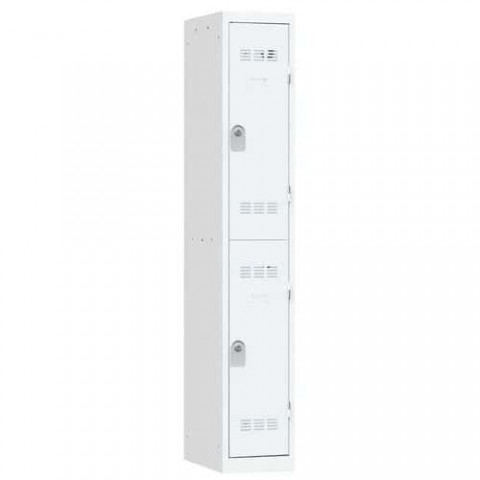 Více-oddílová šatní skříň svařovaná z ocelového plechu tloušťky 0,7 mm. Každý oddíl je vybaven tyčí na ramínka a dvěma háčky (uzamykání cylindrickým zámkem se dvěma klíči). Perforovaná dvířka zajišťují účinné odvětrávání vnitřního prostoru. Možnost umístění štítku se jménem.Svařované šatní skříně Vinco, 1 sloupec, 2 boxy, 300 mm, cylindrický zámek