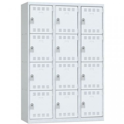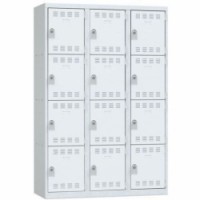 Více-oddílová šatní skříň svařovaná z ocelového plechu tloušťky 0,7 mm. Jednotlivé oddíly jsou samostatně uzamykatelné cylindrickým zámkem se dvěma klíči. Perforovaná dvířka zajišťují účinné odvětrávání vnitřního prostoru. Možnost umístění štítku se jménem.Svařované šatní skříně Vinco, 3 sloupce, 12 boxů, 400 mm, cylindrický zámek