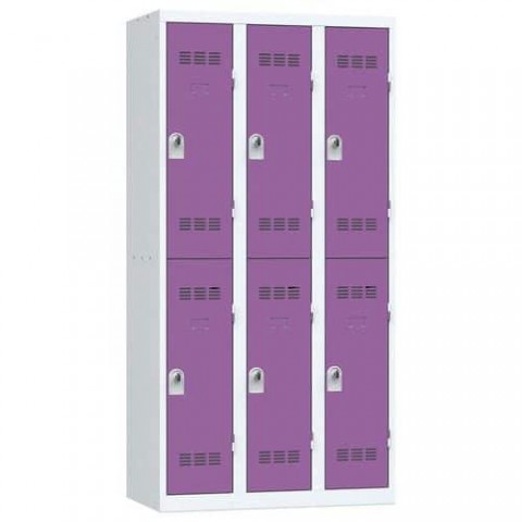 Více-oddílová šatní skříň svařovaná z ocelového plechu tloušťky 0,7 mm. Každý oddíl je vybaven tyčí na ramínka a dvěma háčky (uzamykání otočným uzávěrem na visací zámek - není součástí dodávky). Perforovaná dvířka zajišťují účinné odvětrávání vnitřního prostoru. Možnost umístění štítku se jménem.Svařované šatní skříně Vinco, 3 sloupce, 6 boxů, 300 mm, otočný uzávěr