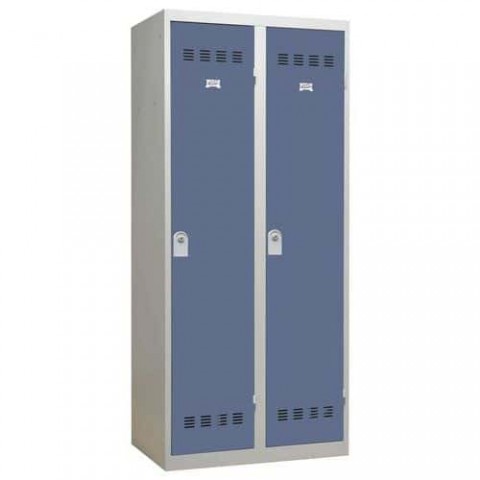 Šatní skříň svařovaná z ocelového plechu tloušťky 0,7 mm. Každý oddíl je vertikálně rozdělen mezistěnou umožňující odložení čistých a špinavých oděvů. Každý oddíl je vybaven tyčí na ramínka a dvěma háčky. Uzamykání jednobodovým cylindrickým zámkem se dvěma klíči. Perforovaná dvířka zajišťují účinné odvětrávání vnitřního prostoru, možnost umístění štítku se jménem.Svařované šatní skříně Vinco s mezistěnou, 2 oddíly, 400 mm, cylindrický zámek