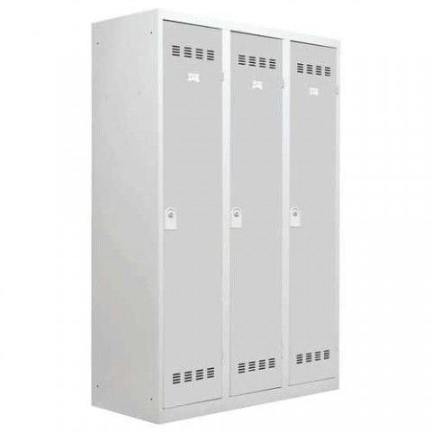Šatní skříň svařovaná z ocelového plechu tloušťky 0,7 mm. Každý oddíl je vertikálně rozdělen mezistěnou umožňující odložení čistých a špinavých oděvů. Každý oddíl je vybaven tyčí na ramínka a dvěma háčky. Uzamykání jednobodovým cylindrickým zámkem se dvěma klíči. Perforovaná dvířka zajišťují účinné odvětrávání vnitřního prostoru, možnost umístění štítku se jménem.Svařované šatní skříně Vinco s mezistěnou, 3 oddíly, 400 mm, cylindrický zámek